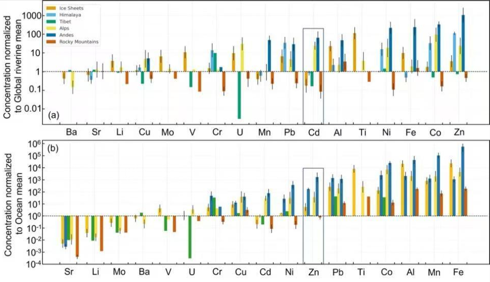 全球变暖背景下冰川加速退缩,冰川融水化学组成持续发生改变,山地冰川环境中的溶解态痕量金属既是下游生态系统所需的关键微量营养元素,也可能成为潜在污染物,其释放正受到越来越多关注。然而,目前不同类型冰川系统中痕量金属迁移释放的控制机制仍缺乏系统认识,特别是对山地冰川与极地冰盖的对比研究不足。 中国科学院西北生态环境资源研究院冰冻圈科学与冻土工程全国重点实验室康世昌研究员团队,开展了全球尺度山地冰川与极地冰盖融水中溶解态痕量金属浓度及迁移特征对比研究。该研究整合了喜马拉雅冰川新的野外观测数据,以及青藏高原、安第斯山、落基山、阿尔卑斯山、格陵兰冰盖和南极冰盖等区域的已发表数据,系统评估了冰川类型对痕量金属释放的控制作用。 研究发现,山地冰川溶解态痕量金属迁移释放能力显著强于极地冰盖,其融水中Zn、Co、Ni、Cd 和 Cu 等元素的浓度明显更高,较全球河流和海洋参考值高出 1 - 2 个数量级,证实山地冰川是更为活跃的溶解态痕量金属释放源。这种差异与山地冰川流域更强的水-岩相互作用、更复杂的岩性组成、更快速的排水系统以及更多新鲜磨蚀反应颗粒密切相关,而极地冰盖则更多受较长的冰下水体停留时间及不同地球化学环境的影响。 研究进一步表明,冰川退缩释放的化学成分对下游生态系统具有双重效应。冰川融水可向贫营养环境输送具有生物学意义的痕量元素,也可能增强潜在有害金属的迁移释放,从而影响下游淡水水质。因此,该研究将冰川地球化学的重要性由单纯的元素迁移问题,拓展到冰冻圈变化与人口密集流域水质安全、生物地球化学过程之间的关联研究,为全球冰川区环境风险评估提供了重要的科学依据。 该成果以Glacier-specific controls on enhanced trace metal mobility across global mountain and polar meltwaters为题,发表在国际期刊 Communications Earth & Environment上。西北研究院博士后Shipika Sundriyal为第一作者,Tanuj Shukla 副研究员为通讯作者。该研究得到甘肃省博士后科研基金的资助。 论文链接:https://doi.org/10.1038/s43247-025-03064-9. 冰川与冰盖融水中痕量金属浓度相对于全球河流和海洋平均浓度的对比 全球尺度下冰川与冰盖融水中痕量金属的迁移释放特征